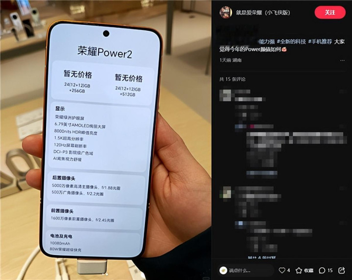 荣耀Power2正面将配备一块6.79英寸1.5K直屏,分辨率为2640 x 1200,后置5000万像素主摄,并撑合手80W快充。